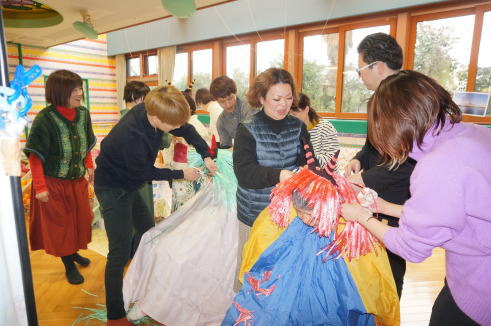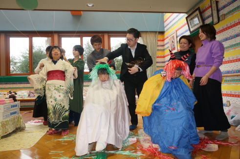 食後は、髪の毛が伸び放題の鬼さんが登場。きれいにカットしてほしいと泣いていたので、ビューティサロンモリワキのみなさんがカットして下さることになりました。