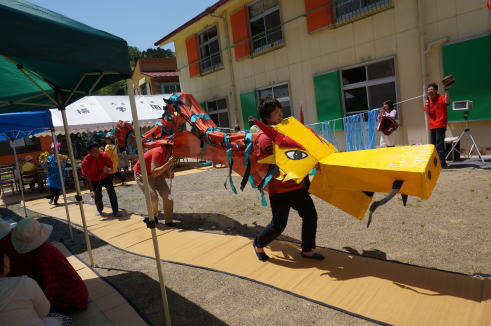 お肉たくさん食べた鯉さんは、お腹が一杯になって龍になって空高く飛んでいきました。