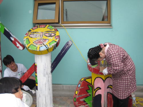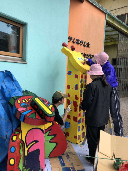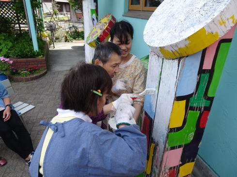止揚学園の玄関にあるトーテムポールのペンキが剥がれてきたのでので、皆で塗り直しました。