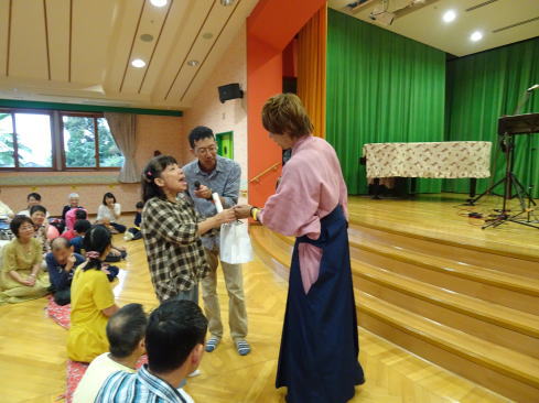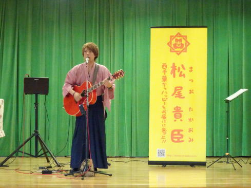 「歌う坂本龍馬」松尾貴臣さんコンサート シンガーソングライターの松尾貴臣さんが止揚学園に来て下さりライブをして下さいました。 松尾貴臣さんはプロのシンガーソングライターとして年間350回程度のライブ活動を展開されています。 止揚学園に来て下さったのは今日で3回目です。 みんなノリノリです!! 透明感のある歌声、心に染みる優しい歌詞、とっても素敵な優しい時間を過ごすことができました。 CDやタオルなどのグッズの販売をされ、サインしてくださいました。 松尾さん、ありがとうございました!! 松尾貴臣さん公式ホームページ