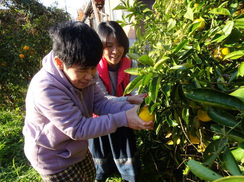 毎年この時期になるとみんなで収穫して、美味しくいただいたり柚子はお風呂に入れて楽しんだりしてきました。残念ですがこの木を伐らないといけなくなり、みんなで「ありがとう」と感謝の時をもって最後に収穫しました。