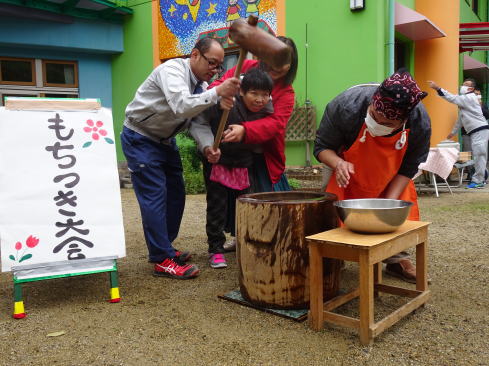 毎年、杵と臼で餅つきをして下さり、つきたてのお餅をみんなでいただきます。