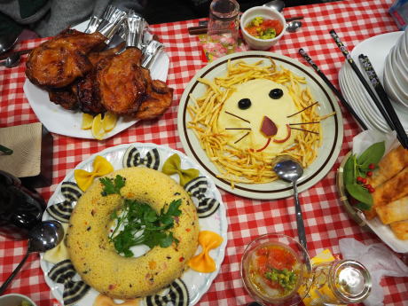 楽しみな食事の時間。腕を振るった御馳走が並びます。ライオンのお殿様もいます。