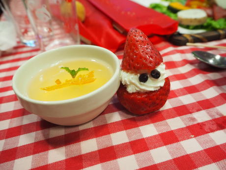 デザートの柚子ジュレとイチゴのサンタさん。先日建物が建つ場所にあった柚子の木にお別れをしたのですが、その時最後に収穫した柚子からとれた果汁です。(詳しくは前回のブログをご覧ください)