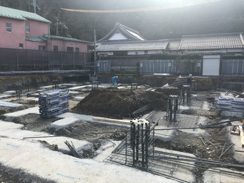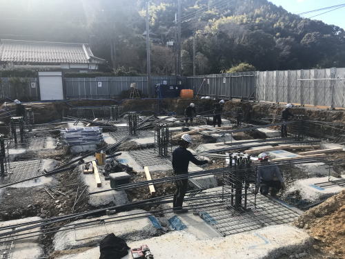 建物の基礎部分、鉄筋の組み立て作業。