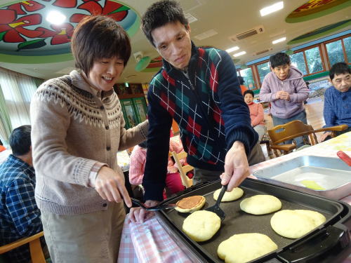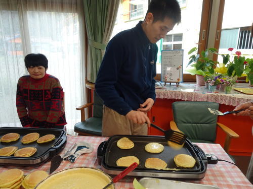 寒いので室内でホットケーキつくり。みんなわくわくです。