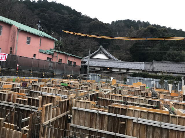 この型枠は職人さんたちの手でひとつひとつ組み立てられていて、一つひとつの木はとても大きくて重そうで、すごい重労働だとはたから見学させていただいていて感じました。