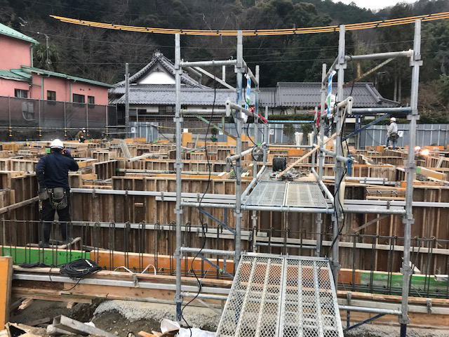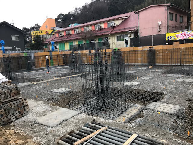 こちらは住宅棟。鉄筋が組み立てられ配筋検査も終わり、木の型枠が設置されています。この型枠に今日コンクリートが流し込まれています。晴れて良かった(*^_^*)