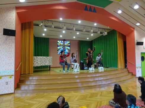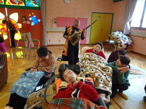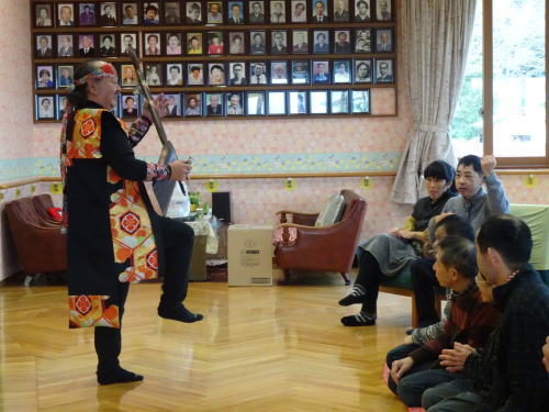 2016年、止揚学園の若い男性職員たち津軽でがスコップ三味線を観て楽しかったので、止揚学園のクリスマスの時に演奏してくれました。その様子をYouTubeでアップロードしたのを、館岡屏風山さんが観られて、昨年の春にこれぞ本家本元とスコップ三味線の演奏をして下さったのです。