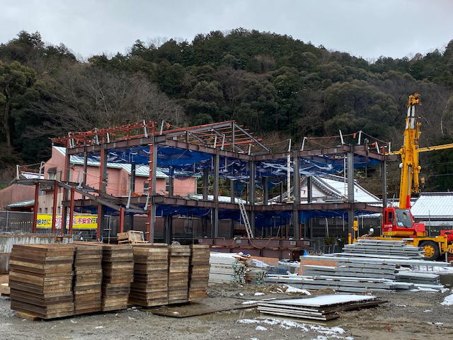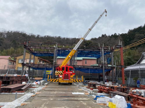 住宅棟の鉄骨の建方、あっという間に高く組み立てられ・・・