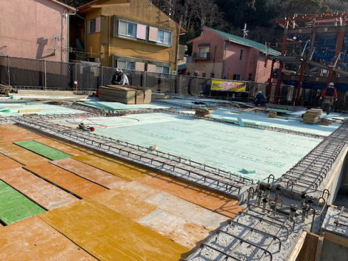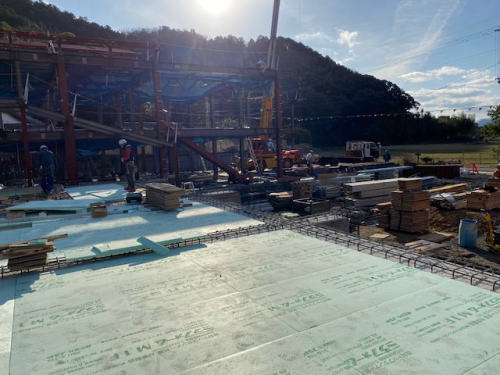 みんなの住む家(本館棟)の床部分に断熱材を貼っておられます。今の本館は築40年以上、床下が土なので冬は寒いです。今度の建物は冬も暖かく過ごせそうです。