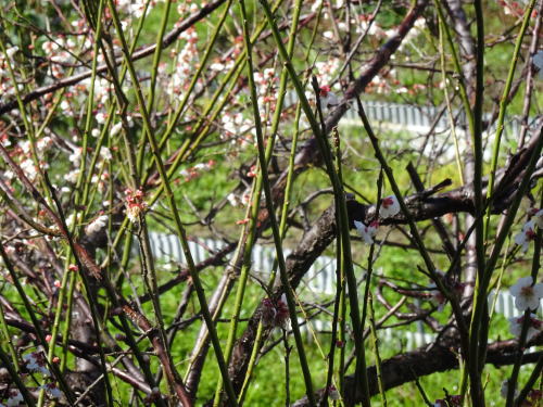 梅の花がほころび始めました。が、あられに雨の寒いさむい一日でした。