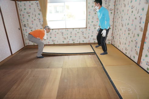 干した畳はパンパンと、溜まった埃をはたいた後、もとに戻していきます。