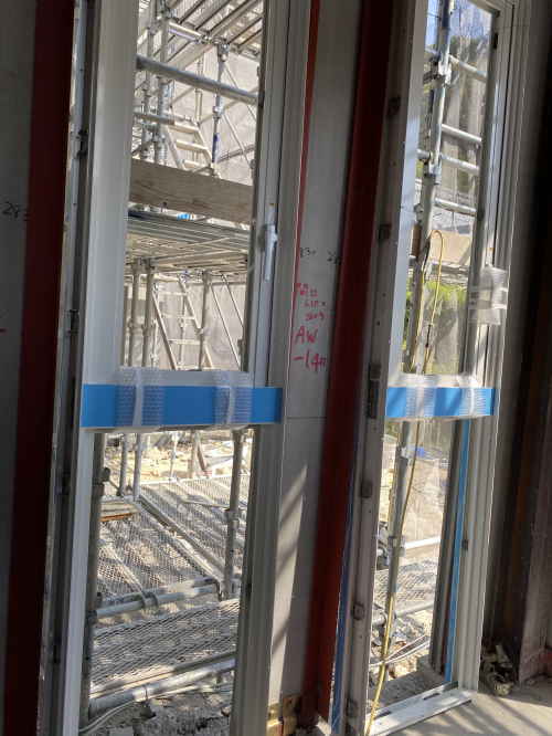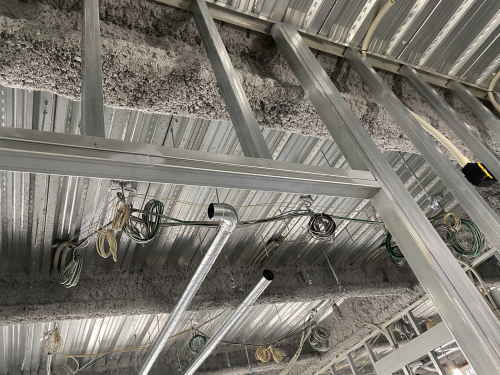 住宅棟の天井は耐火被覆吹きつけが終わっています。