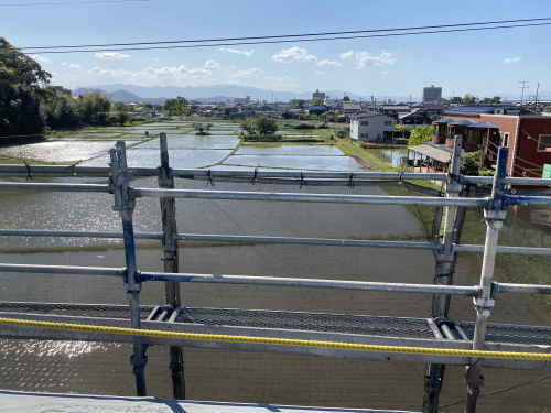 R階からの景色、湖西の山々が見え、水を張った田んぼがキラキラと輝くこの美しい景色は、滋賀ならではです。