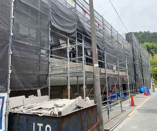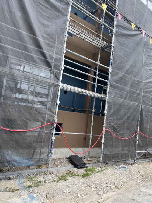 住宅棟の外壁のメッシュシートがとれました。青と茶色がおしゃれです(*^_^*)
