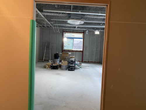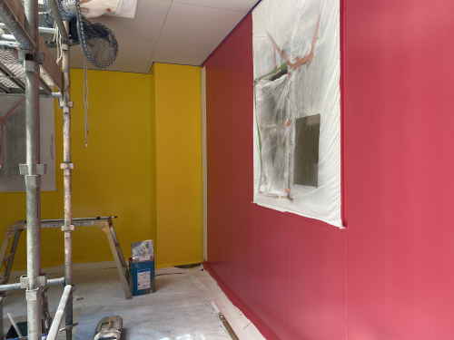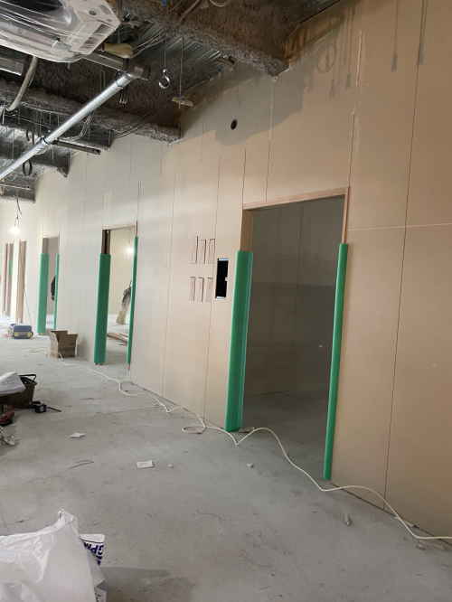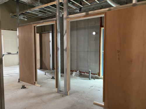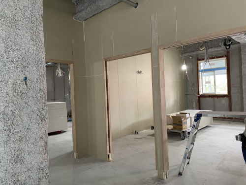 前回はまだ広々とした空間でしたが、それぞれの居室に間仕切りボードが貼られていました。