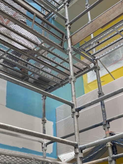 住宅棟の中庭の外壁の色塗りが始まっていました。