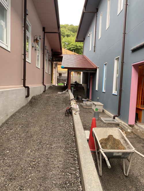毎日大雨の中の工事をして下さっている皆様は本当に大変です。でも雨の中、新本館棟と新住宅棟の間の通路の外構工事もここまで出来上がってきました。