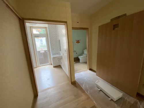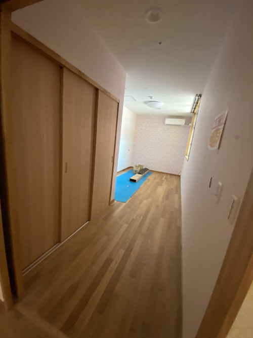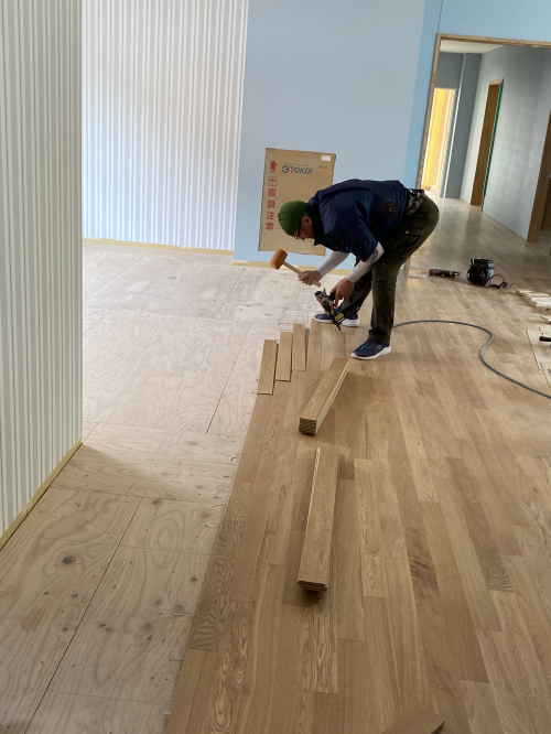 新住宅棟の工事の様子です。フローリングを貼って下さっています。