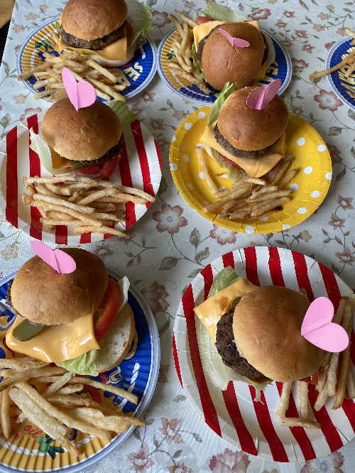 今日の昼食の献立は手作りのハンバーグをはさんだハンバーガーと揚げたてフライドポテト。ハワイアンソングをかけていただきました♪