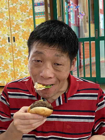 ♫マークドナールド♪と歌いながら食べる人もいて大笑いしました。「マクドナルドじゃないよ。今日はハワイアンハンバーガーですよー」と作った職員の声WW