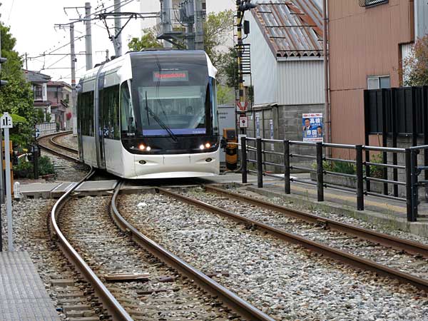 人家の脇をかすめる様にのんびりと走るライトレール(奥田中学校前)