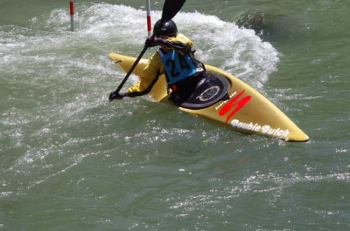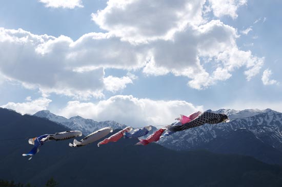 山から吹き降りる風に泳ぐ鯉のぼりに見送られ