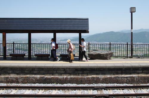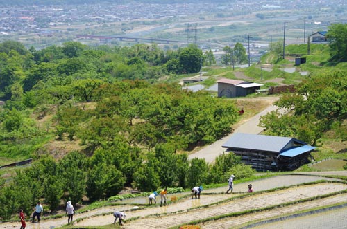 | 善光寺平を見下ろすJR姨捨駅 | 姨捨の棚田では田植えの真っ最中 | |