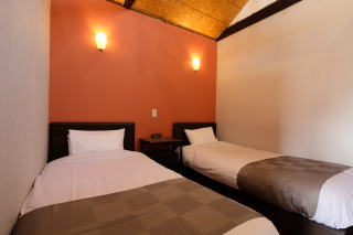 | 各棟に分かれたコテージタイプの宿泊となります。※チェックインやお食事は本館までお越しください。 1棟4名まで利用可能(常設シングルベット2台、布団最大2組)、室内はダイニングスペース、小上がり、トイレ、洗面、バスルームを設けております。 |