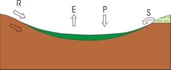 ![]() | 窪地の湿地 地下水の供給を受ける湿地は直接帯水層に接している。流入は、地下水位が高い時は、地下水湧出に支配され、降水および地表水の流入、湧水は補助的。流出は蒸発と、地下水位が低い時は地下水涵養。 |