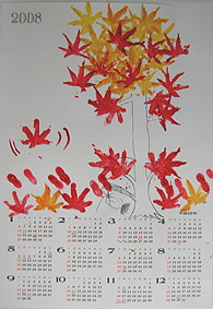 いろいろな形のスタンプ、スポンジローラー、葉っぱ、筆ペンを使って、