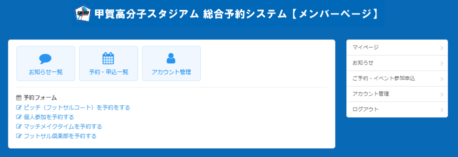 からログインすると「メンバーページ」に移動します。「マイページ」の予約フォームから”フットサルコート(ピッチ)”や”個人参加”等の各種予約を行うことができ、予約・申込み状況を確認することができます。