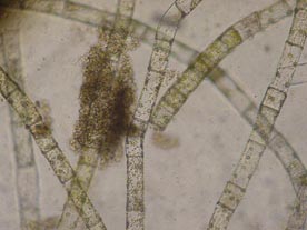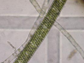 そこで藻を採取して、顕微鏡で見てみました。でも名前がわからないので専門家の先生にお尋ねしたところアオミドロとサヤミドロであることが判明しました。