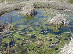 春になって、メダカ池のホテイアオイはすっかり枯れたままだったので、全部引き上げたところ昨年の夏よりわずかながら繁殖していた藻(も)が一面に増えてきました。
