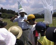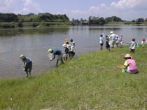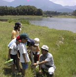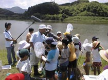 説明の後は、いよいよダムの水辺調査です。みんな一斉にアミとかごをもって水の中へ飛び込みました。オタマジャクシ、タイコウチ、タガメ、ヤゴ、コオイムシ、タマムシ・・・などいろんな生きものを捕まえ、みんな大はしゃぎでした。