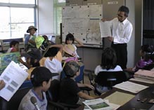 そのあと、みんなで水質測定をしました。COD(化学的酸素要求量)が50mg/lとやや汚れている。PH(水素イオン濃度)が8.4でややアルカリ性。水温29℃、透視度23cmとあまり良くなかったのは意外でした。ダムより上流からの生活排水の影響でしょうか?