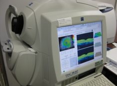レーザー光を照射して得られる組織の情報を断層像として表示する機器で、主に眼科的には眼底の網膜や視神経乳頭、前眼部の角膜や隅角などの構造を眼球には非接触で計測、解析出来ます。