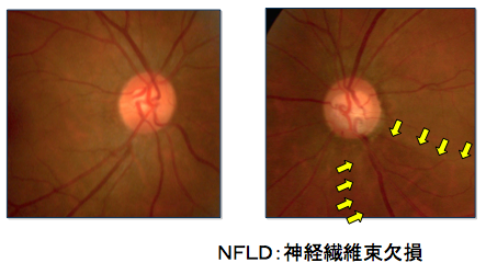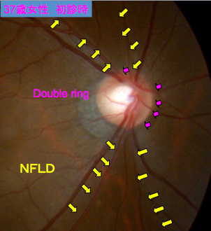 左眼の正常眼圧緑内障:視神経乳頭陥凹と神経繊維束欠損を認める「矢印」