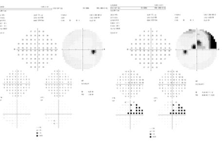 同じ人の視野検査結果:左眼の鼻側上部に視野欠損を認める