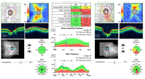 同じ人のOCTによる視神経乳頭部の神経繊維の解析結果:左眼の視神経乳頭下方の神経繊維が非薄化している。