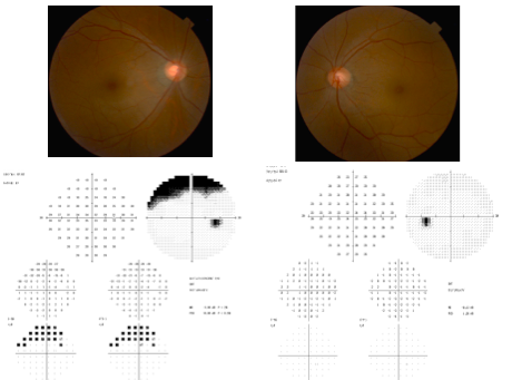 この(2)はとても大切で、生まれつきの視神経低形成(SSOHなど)という疾患のために元々視野欠損を有しているケースが多くあることが知られてきました。この場合、基本的に視野欠損は進行しません。ですから、最初の診断がとても大切になりますし、実際には経過を見ないと診断がつかないケースも多いのが現状です。緑内障の点眼薬は一度開始すると一生の間、続けなくてはなりません。正確な診断が眼科医の役目となります。