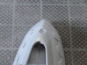 さて、ランナーから切り離す前から疑問だった踵の部分の謎のワゴン様の作り込みについてです。 説明書を読んでみると、このキットは変形しませんが、どうやらアニメの方では車形態に変形するらしいです。マクロスみたいなもんですね。で、この踵の部分は車形態時のタイヤと言う事らしいです。 パーツ部分が途中で切れているのはともかく、タイヤの形状に面白みがないためにタイヤに見えません。そう言うわけで…パテ盛ってみました