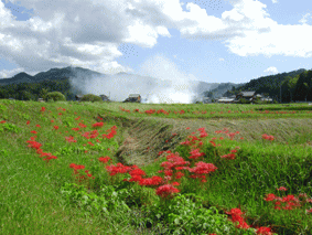 初秋の風さわやかな里山に,鮮やかな赤色が映えます。 |