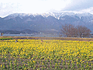 琵琶湖大橋の近く(なぎさ公園)の風景です。琵琶湖をはさんで手前に菜の花畑,後方には比良山地が見えます。山頂(写真右端)には琵琶湖バレイスキー場があります。 (菜の花は,通常より早く開花していますが,これは冬に咲く「カンザキハナナ(寒咲花菜)」という品種で,約12,000本が栽培されているそうです。) なお,菜の花からできる菜種について,「粉粒体の部屋(5)」で紹介しています。