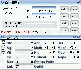 DEX-LUK素ノビがLv98になりました。