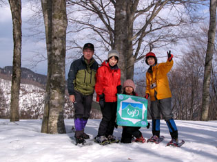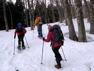 食後はいよいよスノーシューやワカンを付けてトレイルコースを歩く。このところの暖日のため2年前に比べると確かに雪は少なく、前回の半分強くらいで樹氷もない。それでも風がない晴天の中で雪とブナの並木道をトレッキングする快感は言葉で表現できない。しかも今日この付近に入っているのはわれわれだけのようでこの素晴らしい自然を独占している悦びが湧いてくる。