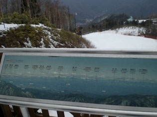 第二リフトをおりたところで、みんなスノーシューを装着する。いよいよスタートだ。少し登ったところに南アルプスの展望場があり、山並みを描いた標識があった。しかし、残念ながら晴天なら本来望めるだろう山々は何も見えなかった。さらに進むと林道への案内看板があった。