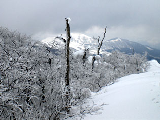間もなく全員が頂上らしき地点に到着。雪に埋もれているのか標識らしきものは見あたらず。頂上からの眺めは氷ノ山方向はダメで鉢伏山方向は綺麗に望めた。また、氷ノ山国際スキー場方面の斜面も滑降に適した美味しそうなバーンにうつった。
