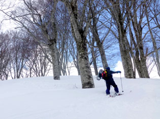 頂上では記念写真を何枚も撮る。順光となる日本海側の眺望が綺麗だ。時刻はもう午後の3時となって滑降に移る。頂上付近は3月の雪とは思えないほどいい感じだった。